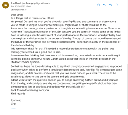 I got in touch with Jon asking if he was able to give me some feedback on my performance in the workshop.